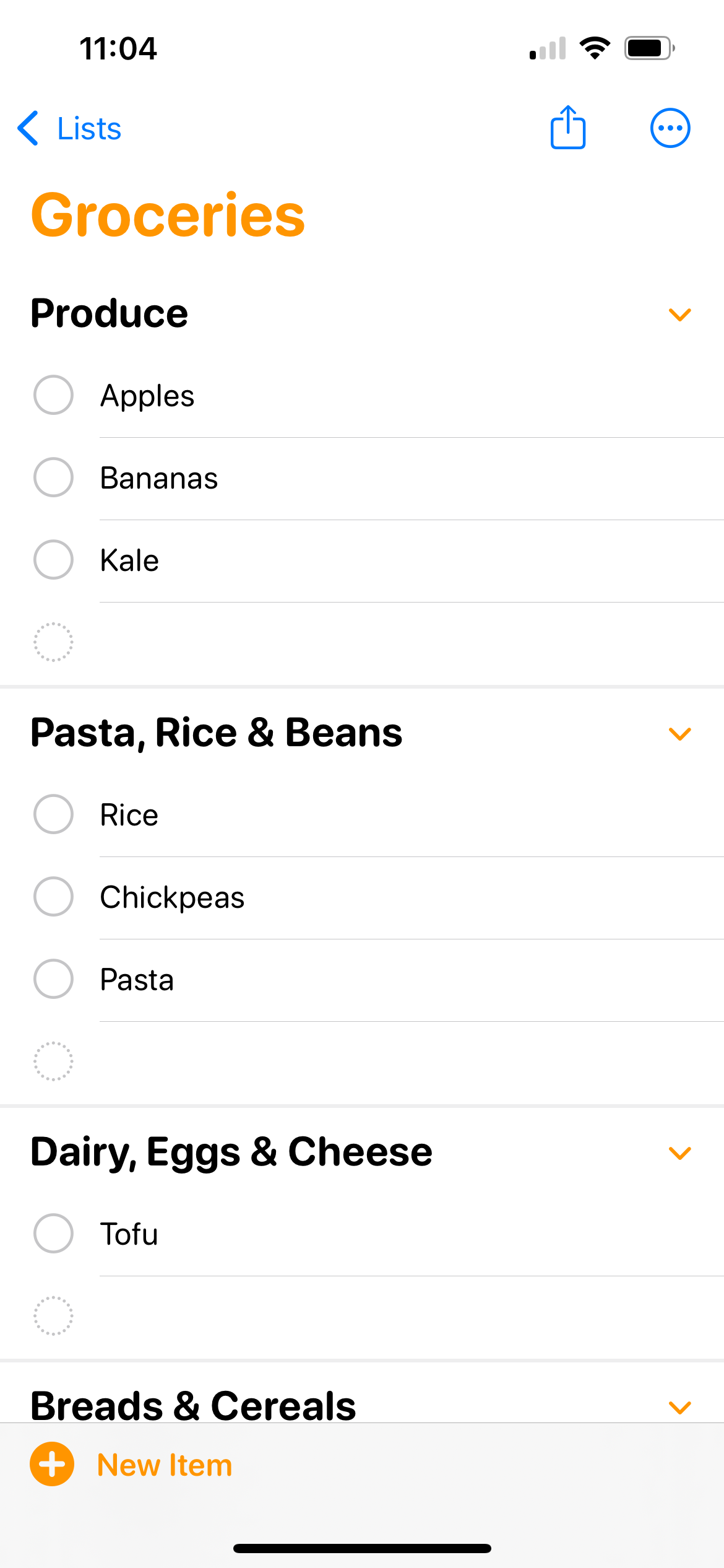 When you make a Reminders list, one of the types is “Grocery list.” While working similarly to the regular list type, the grocery list type will automatically sort items you add into categories, such as Product and Bakery. You can move items to different groups, and the list remembers your preferences.