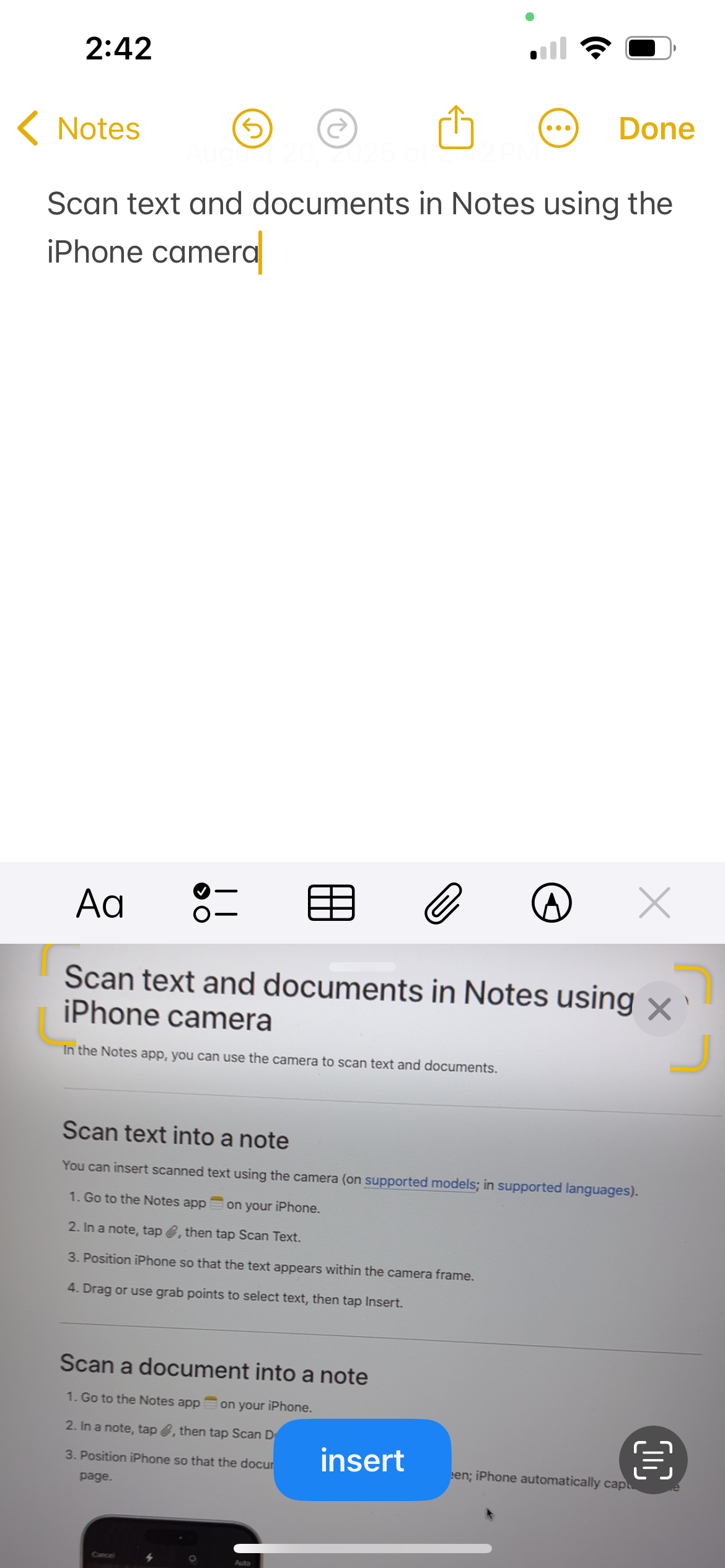 Another hidden feature to get text into a Note is with your camera. You could automatically grab text from anything, like a page in a book, a sign, etc. To use it: